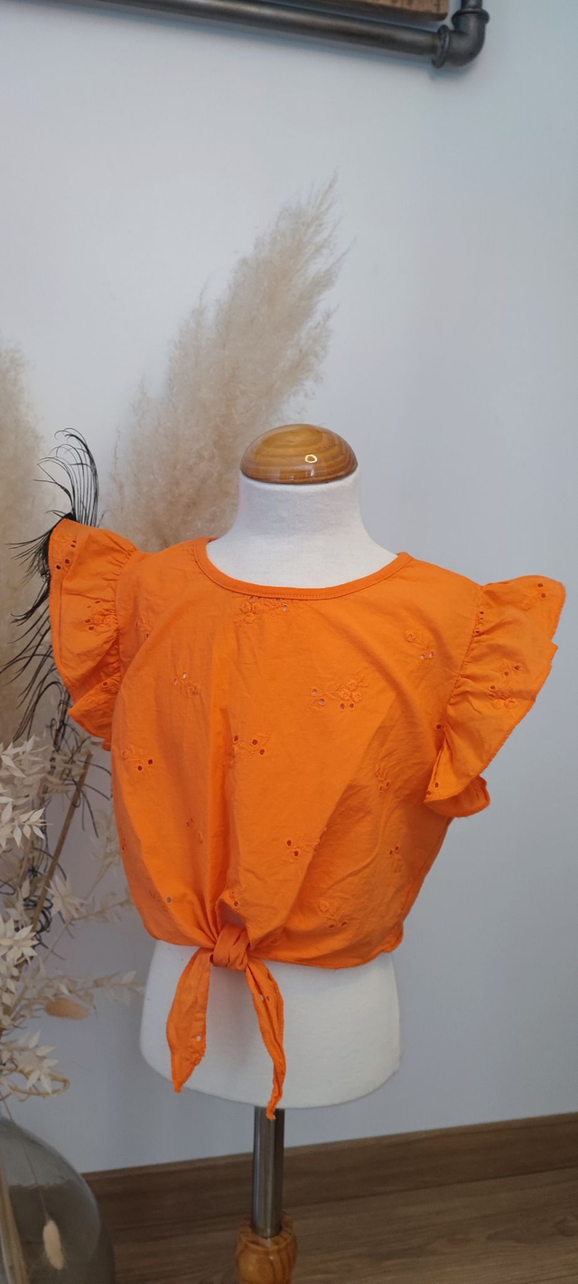 Top court en coton et broderie anglaise, col rond, manches courtes volantées.
