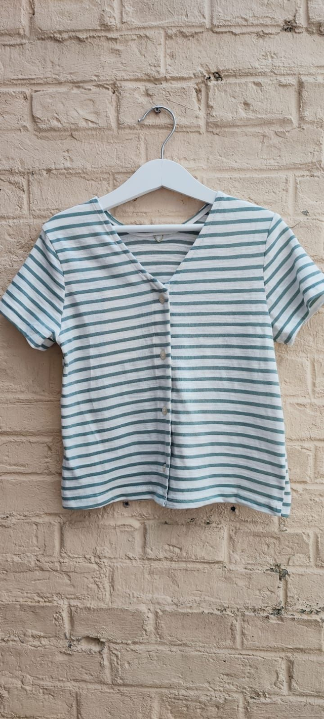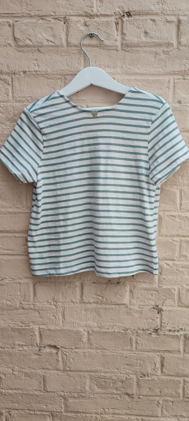 T-shirt à rayures kaki avec petit cœur or brodé sur le devant et boutonné dans le dos.