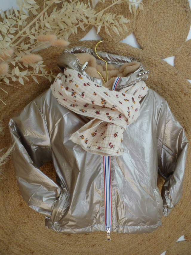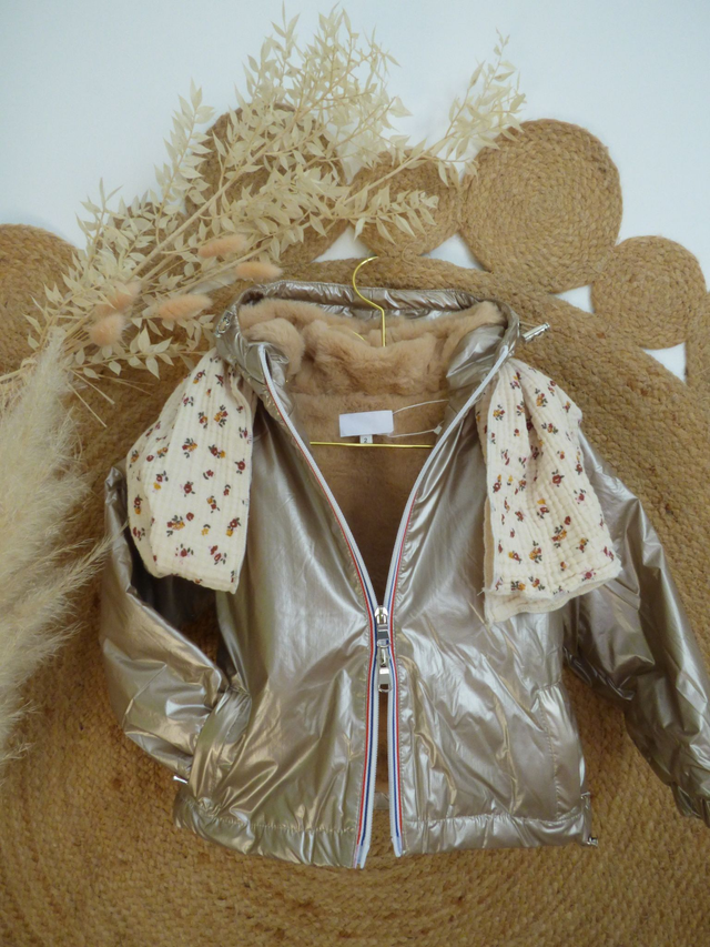 Parka Adele doré capuche et intérieur fourrés, manches longues à poignets élastiques.